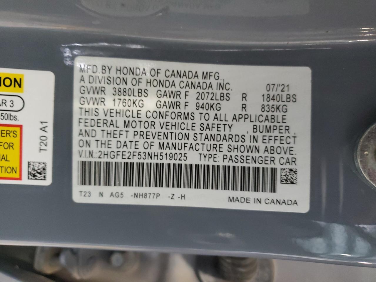 HONDA CIVIC 2.0 2022 р.в., (2HGFE2F53NH519025) з США