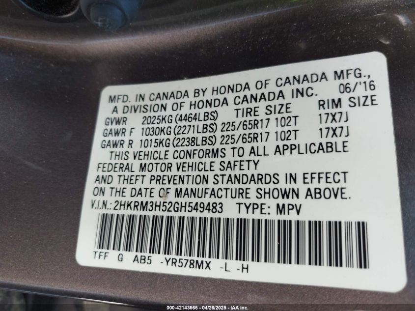 HONDA CR-V 2.4 2016 р.в., Передній привід (2HKRM3H52GH549483) з США
