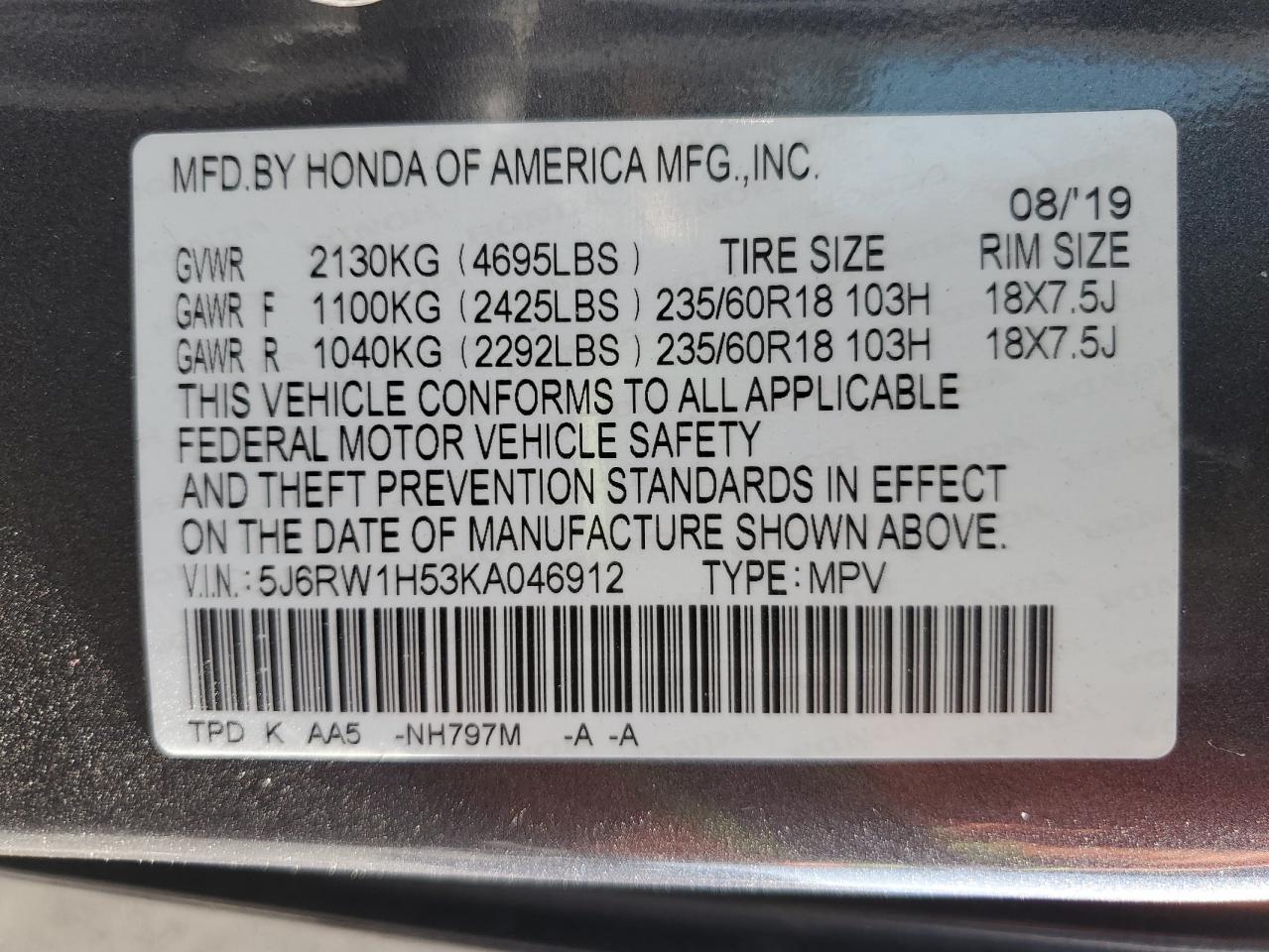HONDA CR-V 1.5 2019 р.в., (5J6RW1H53KA046912) з США