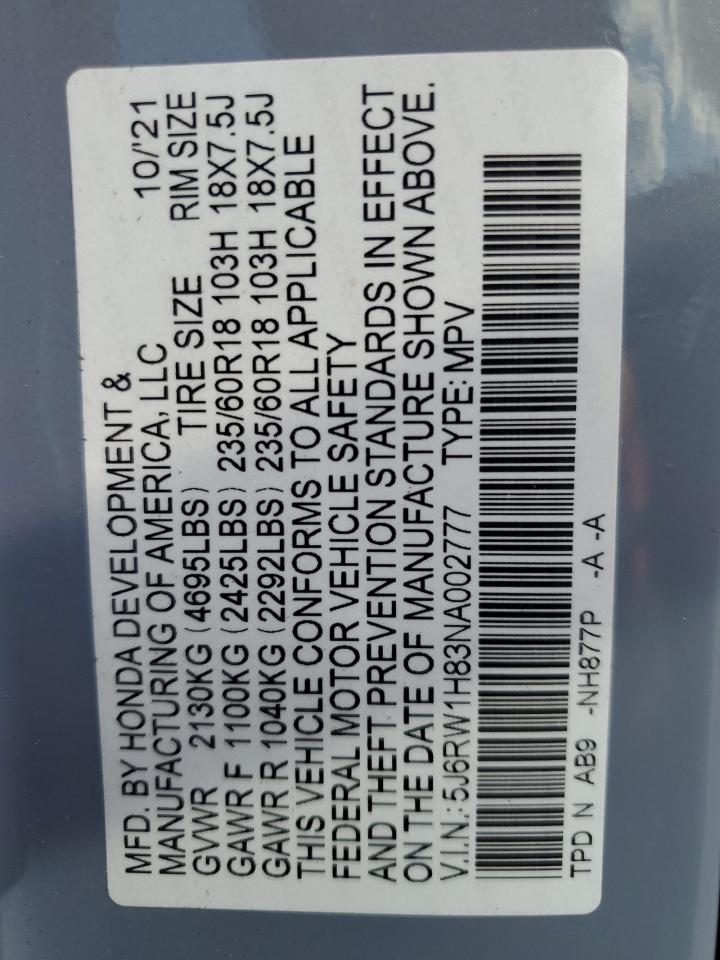 HONDA CR-V 1.5 2022 р.в., (5J6RW1H83NA002777) з США