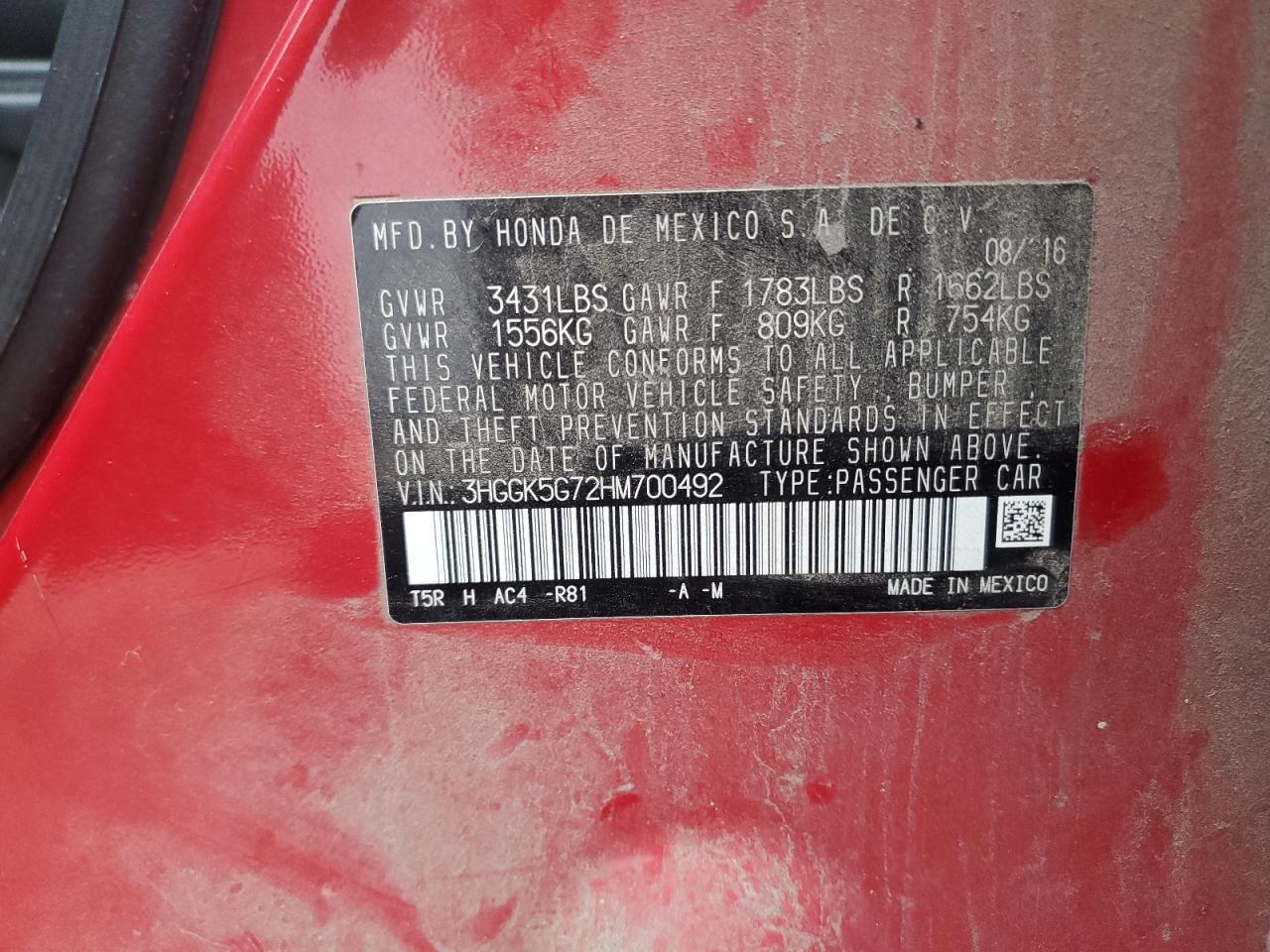 Колір ЧервонийЦиліндри 4VIN 3HGGK5G72HM700492Стан Заводиться та їде (перевірено)Ушкодження НезначніДата аукціону 2025-11-03