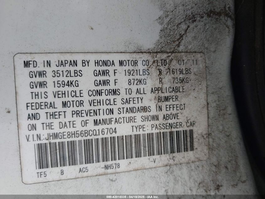 HONDA FIT 1.5 2011 р.в., Передній привід (JHMGE8H56BC016704) з США