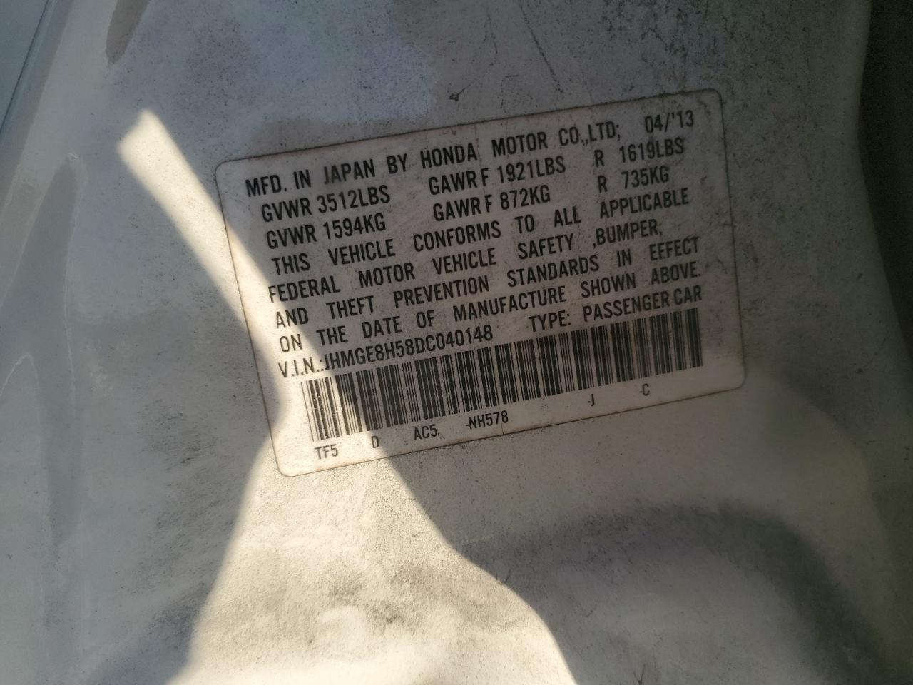 Колір БілийЦиліндри 4VIN JHMGE8H58DC040148Стан НевідомоУшкодження Передня або задняДата аукціону 2025-11-06