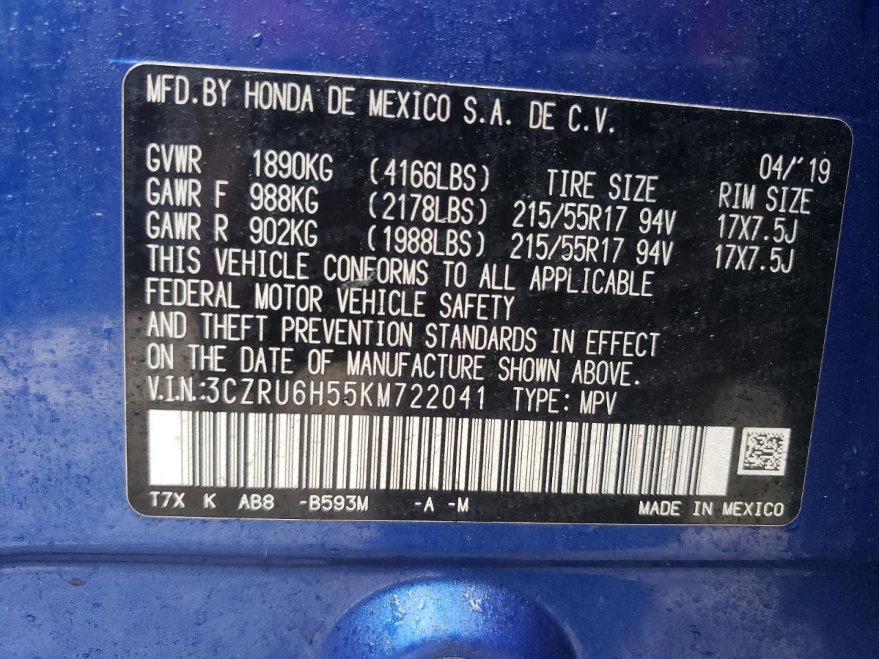 HONDA HR-V 1.8 2019 р.в., Повний привід (3CZRU6H55KM722041) з США