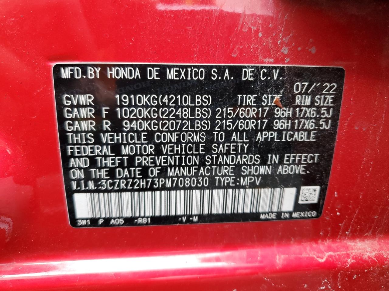 HONDA HR-V 2.0 2023 р.в., Повний привід (3CZRZ2H73PM708030) з США