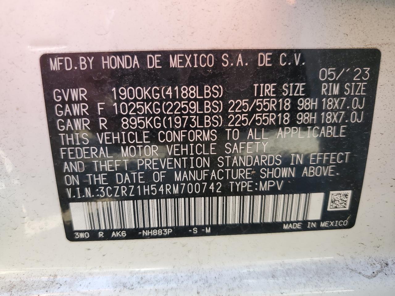 HONDA HR-V 2.0 2024 р.в., (3CZRZ1H54RM700742) з США