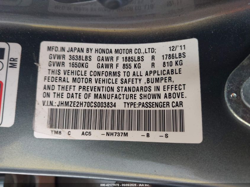 HONDA INSIGHT 1.3 2012 р.в., Передній привід (JHMZE2H70CS003834) з США