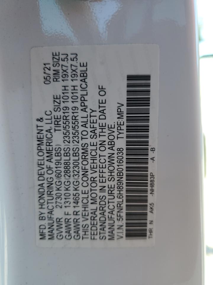 Колір БілийЦиліндри 6VIN 5FNRL6H89NB016038Стан Заводиться та їде (перевірено)Ушкодження Передня або задняДата аукціону 2025-11-05