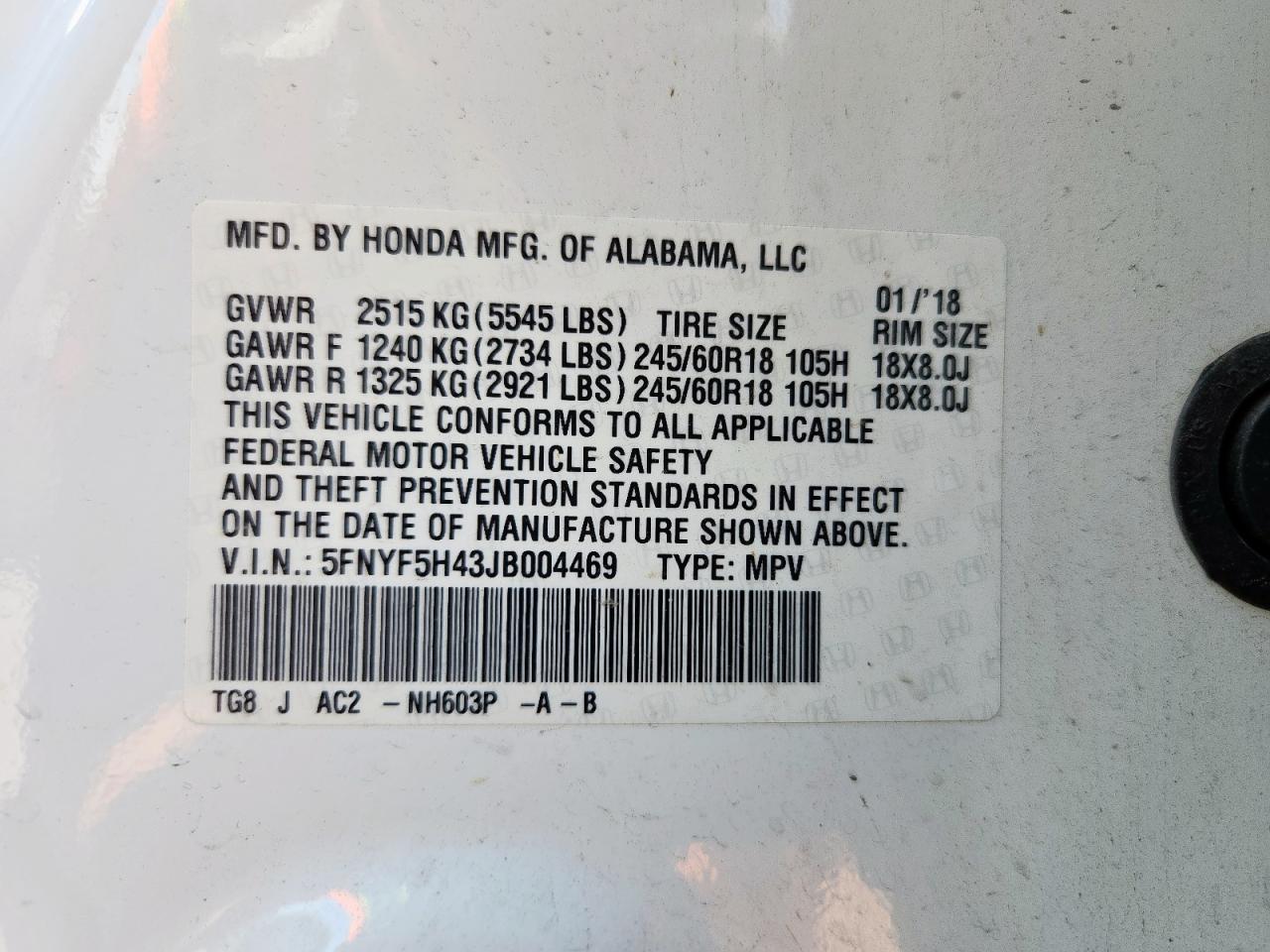 HONDA PILOT 3.5 2018 р.в., (5FNYF5H43JB004469) з США