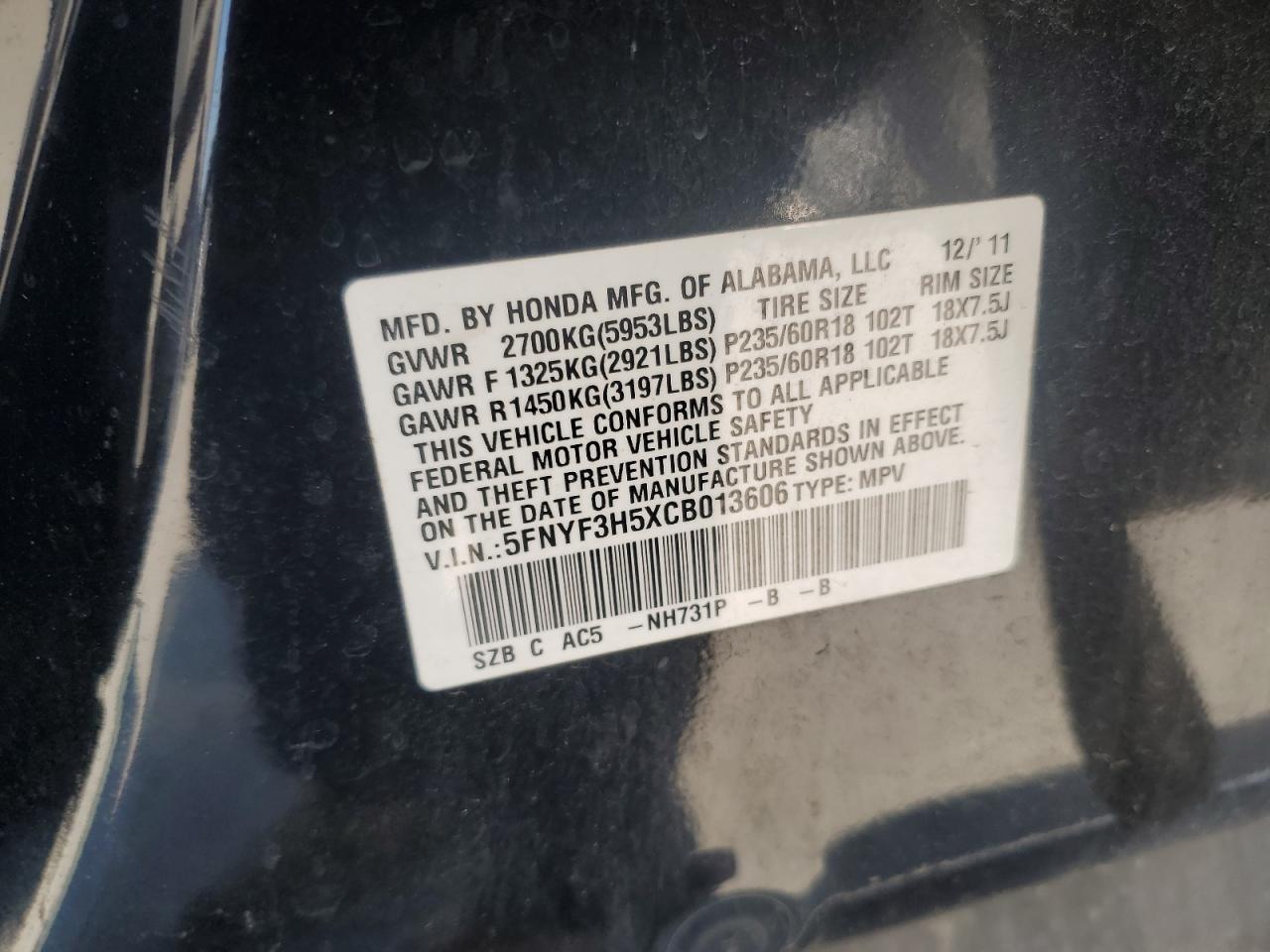 Колір ЧорнийЦиліндри 6VIN 5FNYF3H5XCB013606Стан Заводиться та їде (перевірено)Ушкодження Передня або задняДата аукціону 2025-11-03