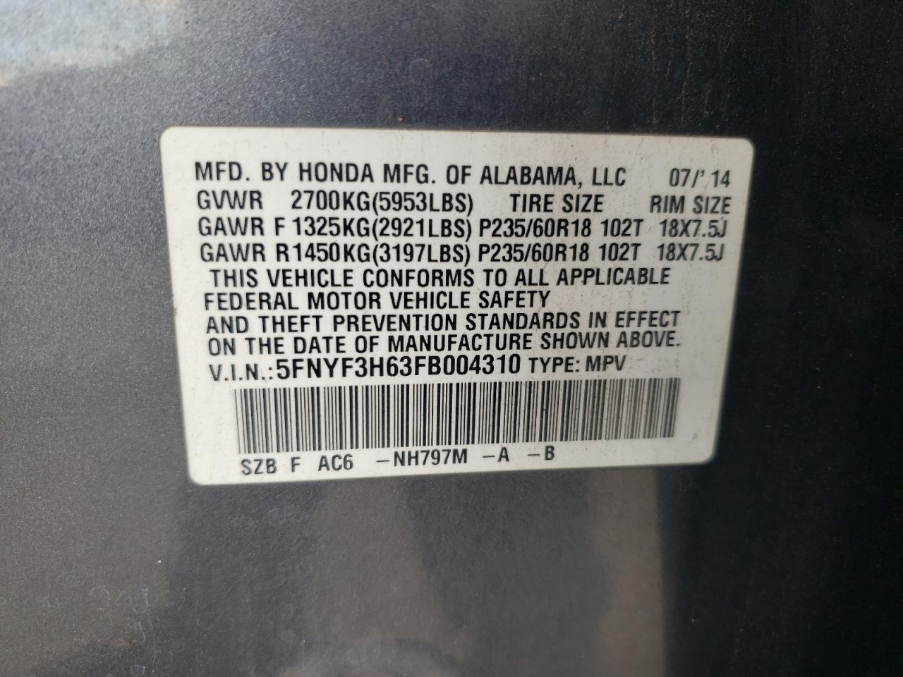 Колір СірийЦиліндри 6VIN 5FNYF3H63FB004310Стан Заводиться та їде (перевірено)Ушкодження Передня або задня