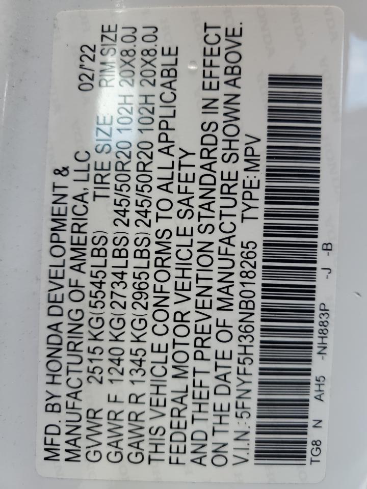 HONDA PILOT 3.5 2022 р.в., (5FNYF5H36NB018265) з США