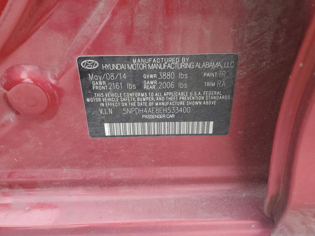 Колір ЧервонийЦиліндри 4VIN 5NPDH4AE8EH533400Стан НевідомоУшкодження Передня або задня