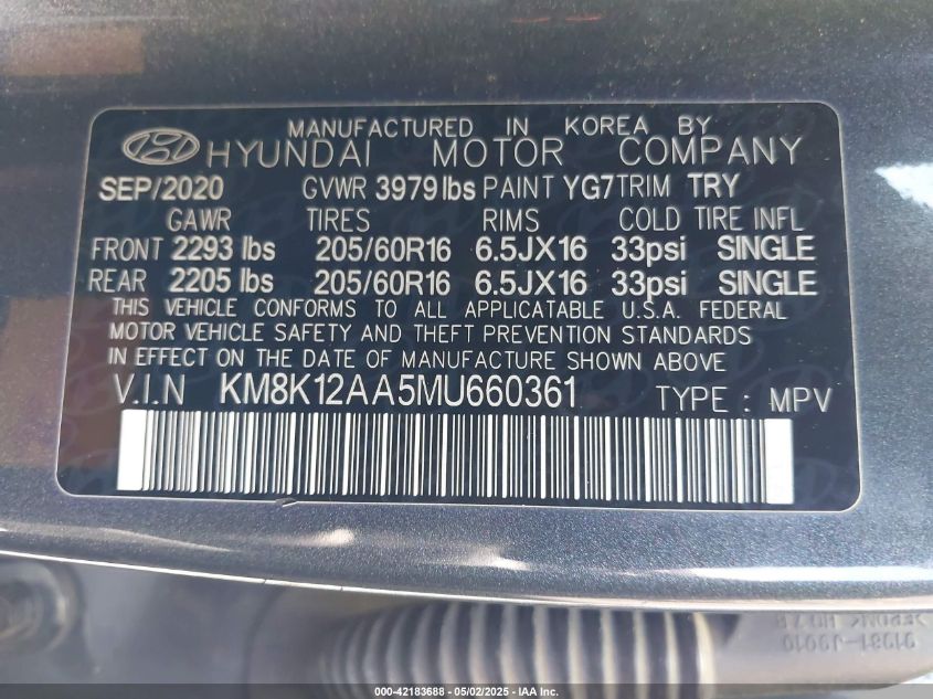 HYUNDAI KONA 2.0 2021 р.в., Передній привід (KM8K12AA5MU660361) з США