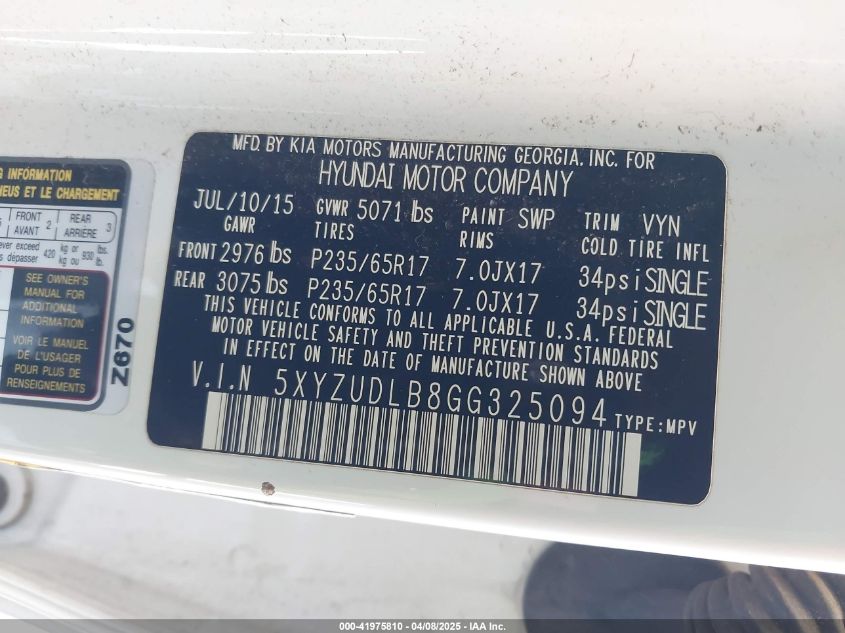 HYUNDAI SANTA FE 2.4 2016 р.в., Повний привід (5XYZUDLB8GG325094) з США