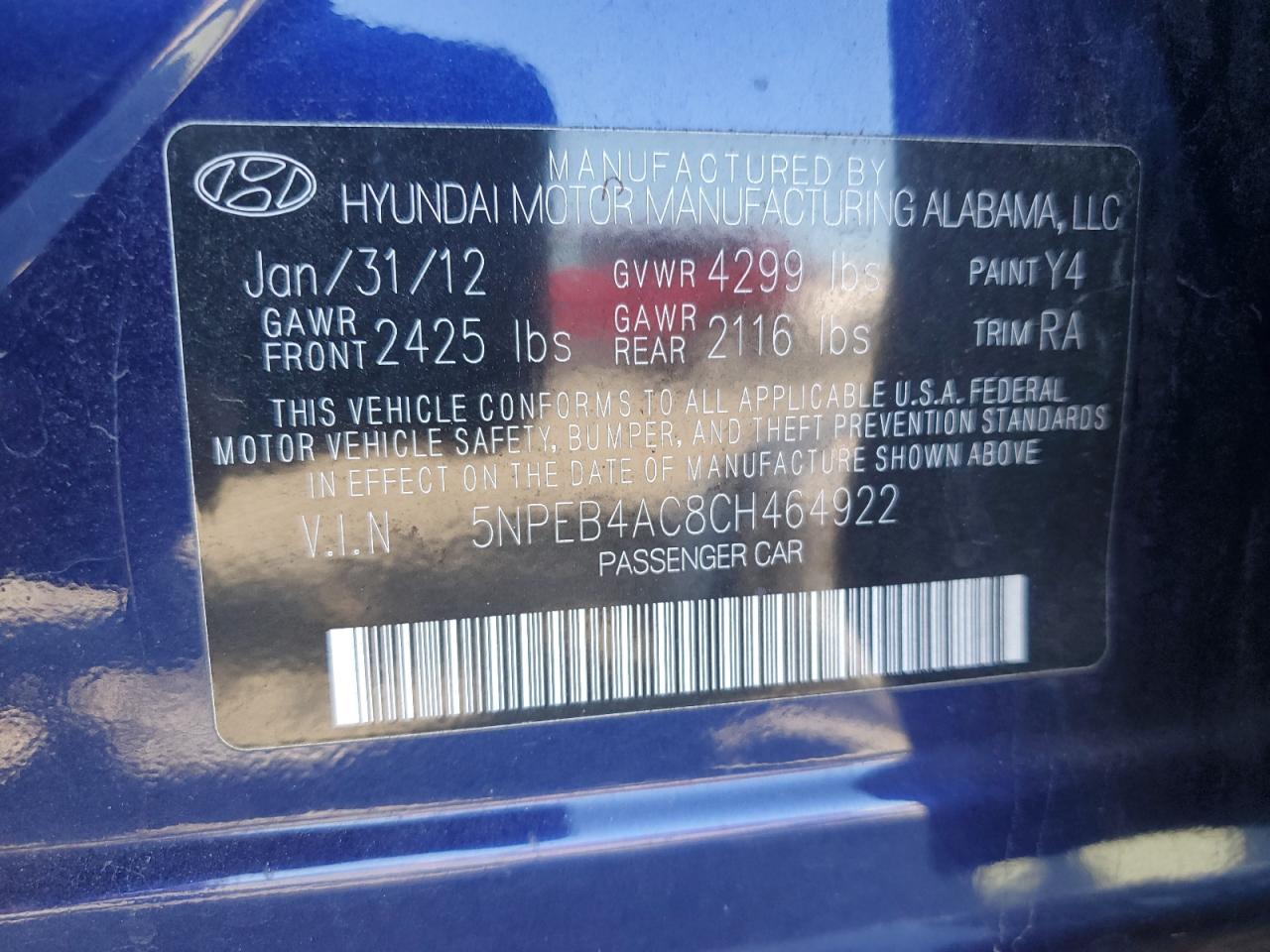 HYUNDAI SONATA 2.4 2012 р.в., (5NPEB4AC8CH464922) з США
