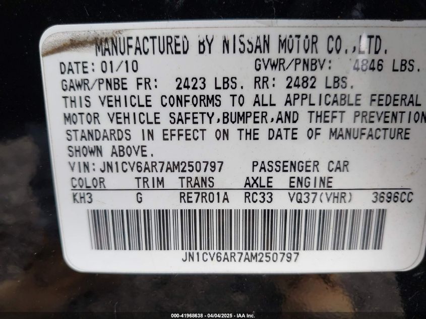 Колір ЧорнийЦиліндри 6Привід Повний привідVIN JN1CV6AR7AM250797Стан СтаціонарноУшкодження Невідомо