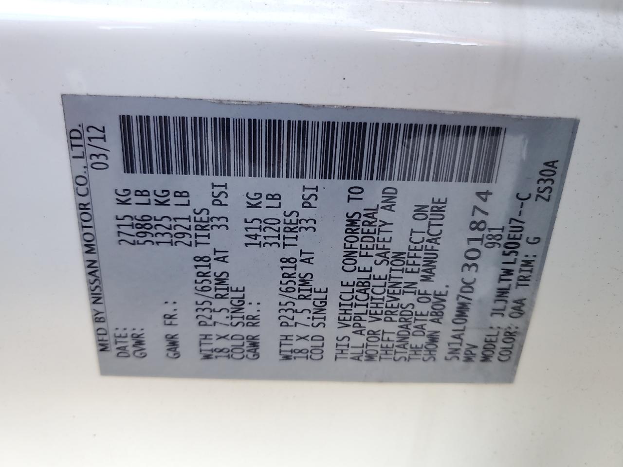Колір БілийЦиліндри 6Привід Повний привідVIN 5N1AL0MM7DC301874Стан Заводиться та їде (перевірено)Ушкодження Задня