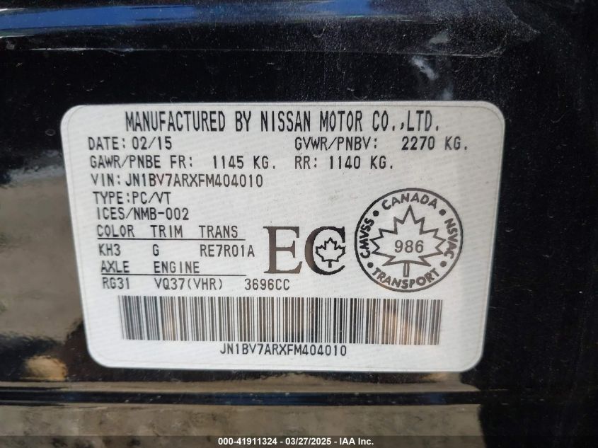 Колір ЧорнийЦиліндри 6Привід Повний привідVIN JN1BV7ARXFM404010Стан СтаціонарноУшкодження Невідомо