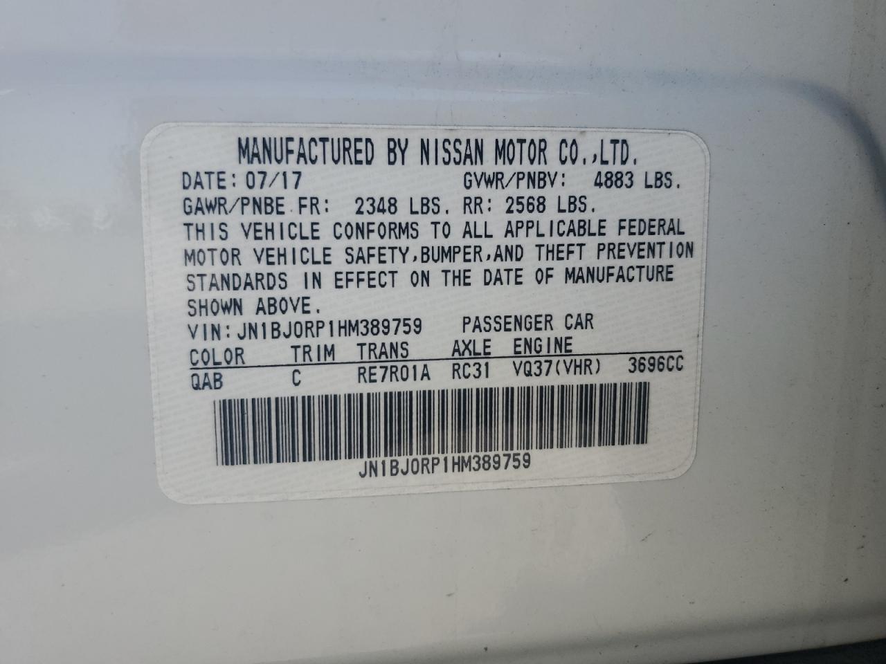 Колір БілийЦиліндри 6Привід Задній привідVIN JN1BJ0RP1HM389759Стан ЗаводитьсяУшкодження З боків
