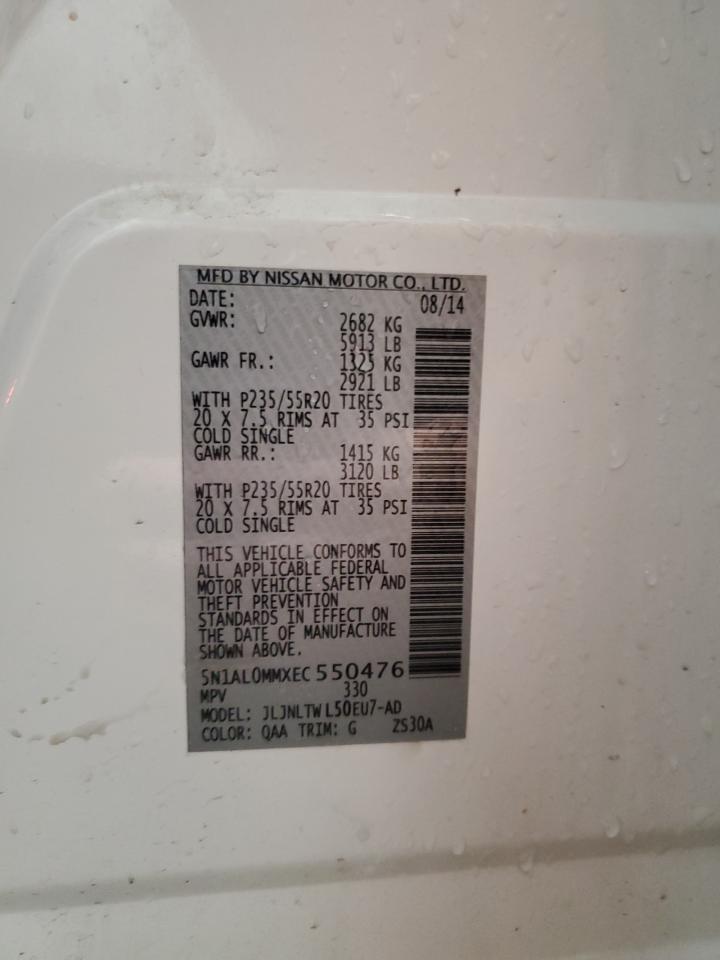Колір БілийЦиліндри 6Привід Повний привідVIN 5N1AL0MMXEC550476Стан Заводиться та їде (перевірено)Ушкодження Задня