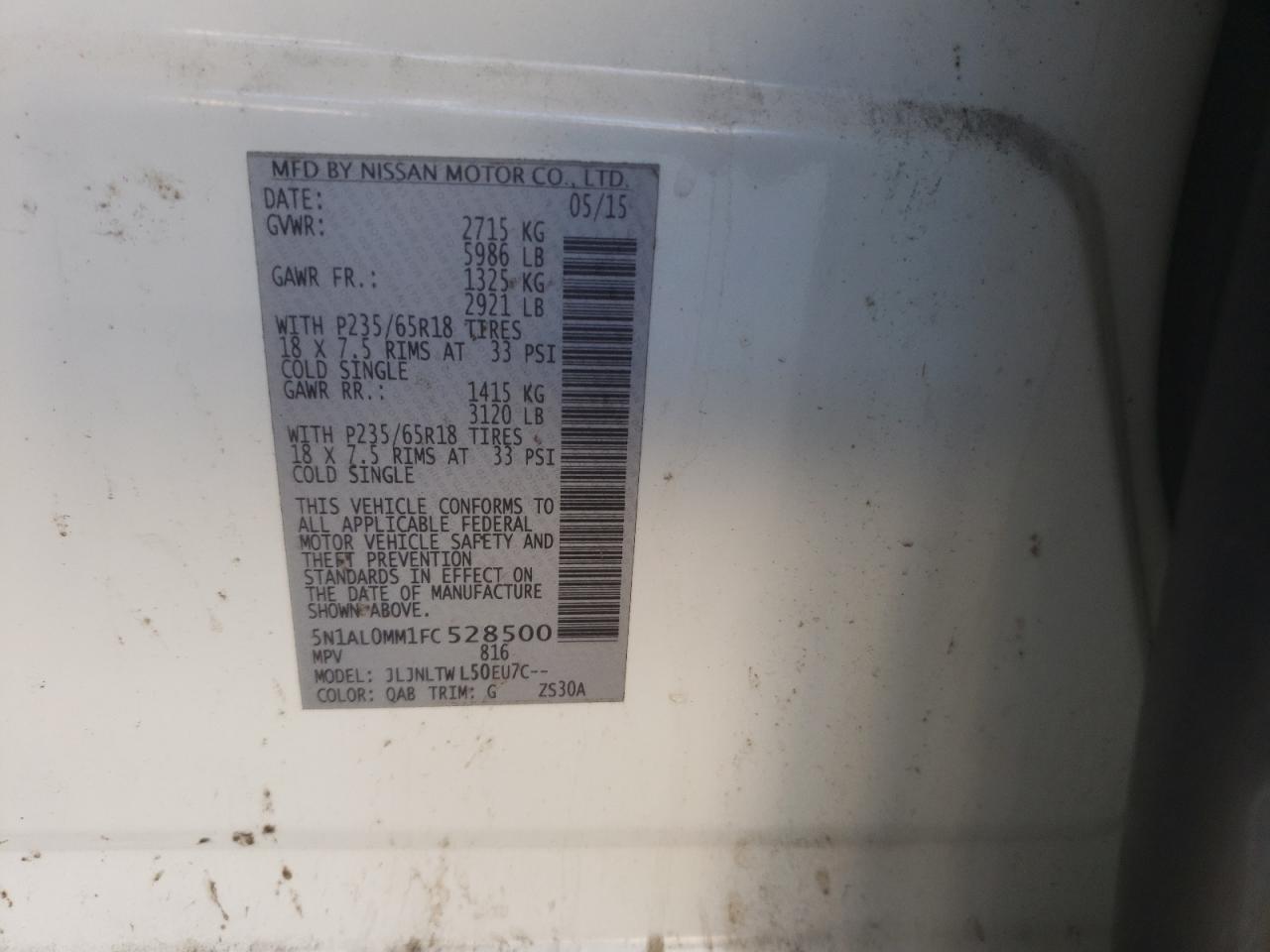 Колір БілийЦиліндри 6Привід Повний привідVIN 5N1AL0MM1FC528500Стан Заводиться та їде (перевірено)Ушкодження НезначніДата аукціону 2025-11-04