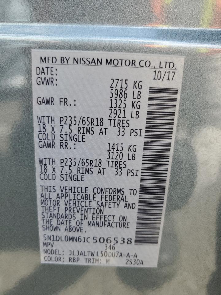 Колір БірюзовийЦиліндри 6VIN 5N1DL0MN6JC506538Стан ЗаводитьсяУшкодження ЗадняДата аукціону 2025-11-04