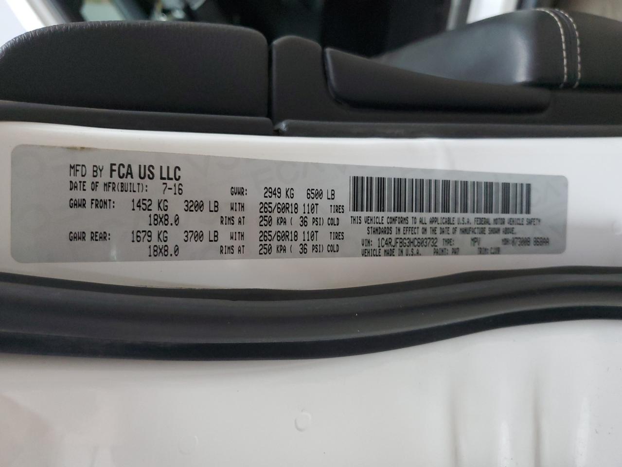 Колір БілийЦиліндри 6Привід 4x4 з заднім приводомVIN 1C4RJFBG3HC603732Стан Заводиться та їде (перевірено)Ушкодження Передня або задняДата аукціону 2025-11-05