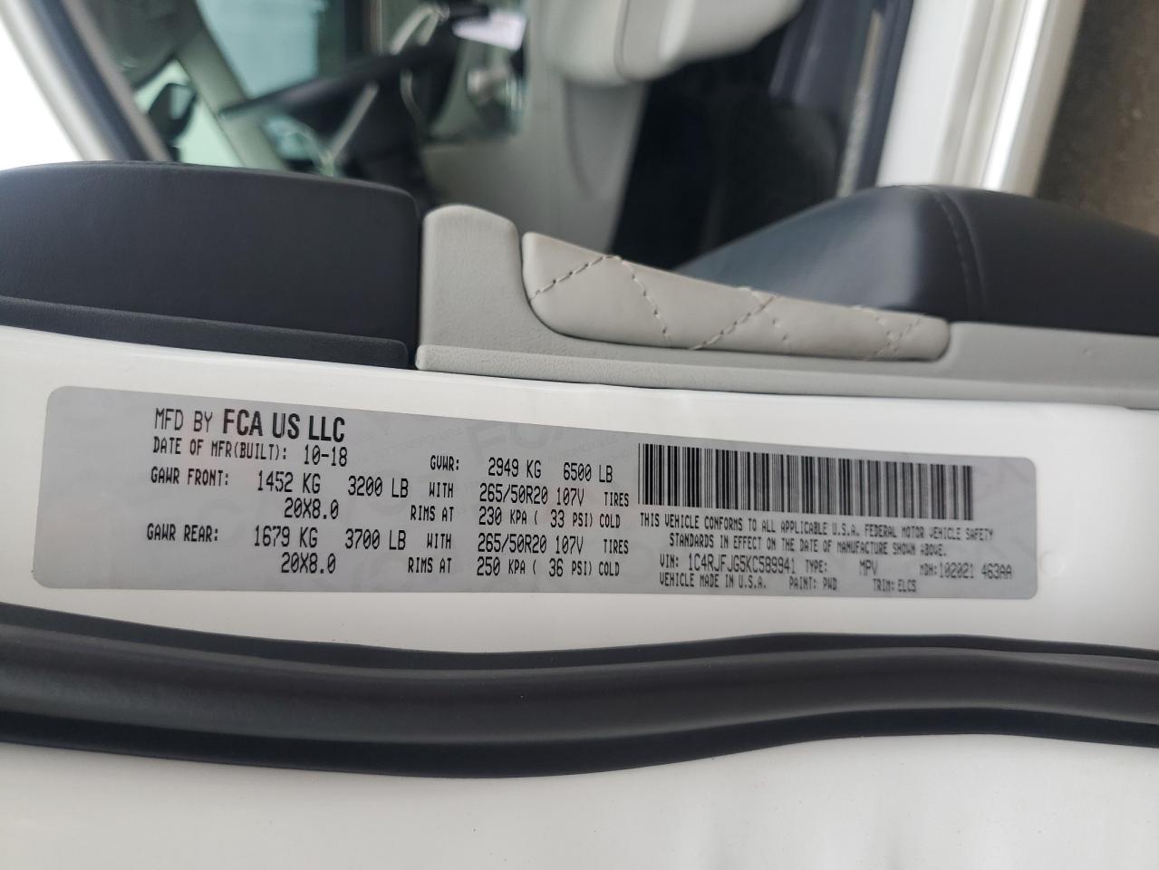 Колір БілийЦиліндри 6Привід 4x4 з заднім приводомVIN 1C4RJFJG5KC589941Стан Заводиться та їде (перевірено)Ушкодження Передня або задняДата аукціону 2025-11-03