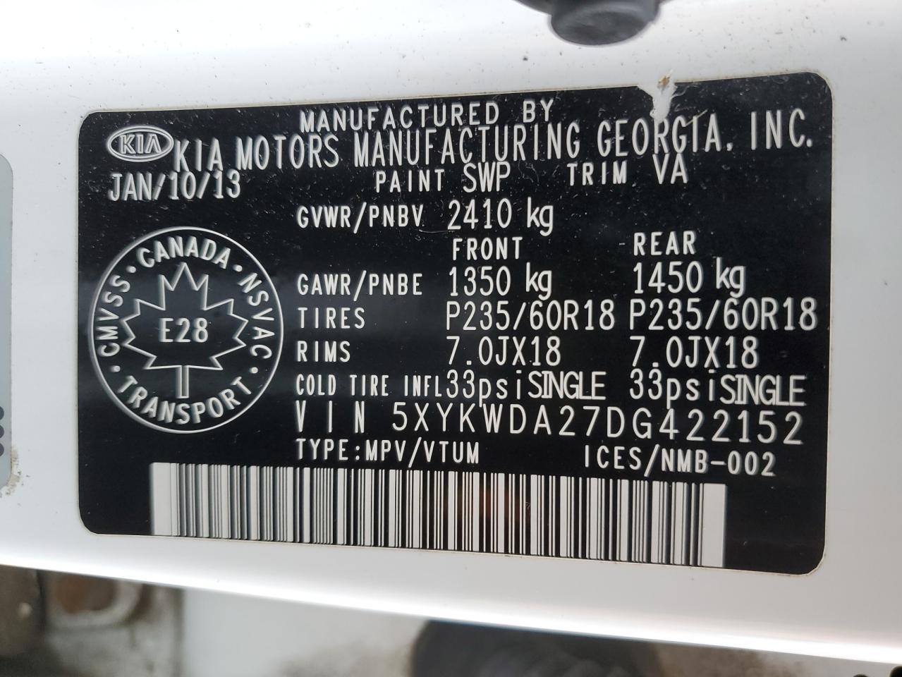 Колір БілийЦиліндри 6Привід Повний привідVIN 5XYKWDA27DG422152Стан Заводиться та їде (перевірено)Ушкодження Передня або задня
