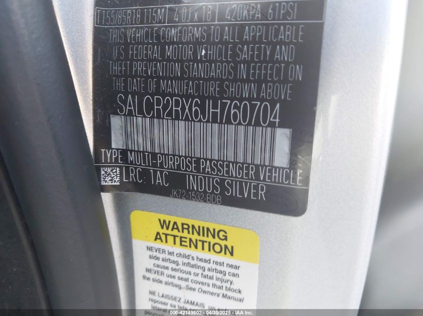 Колір СрібнийЦиліндри 4Привід Повний привідVIN SALCR2RX6JH760704Стан СтаціонарноУшкодження Механічні пошкодження