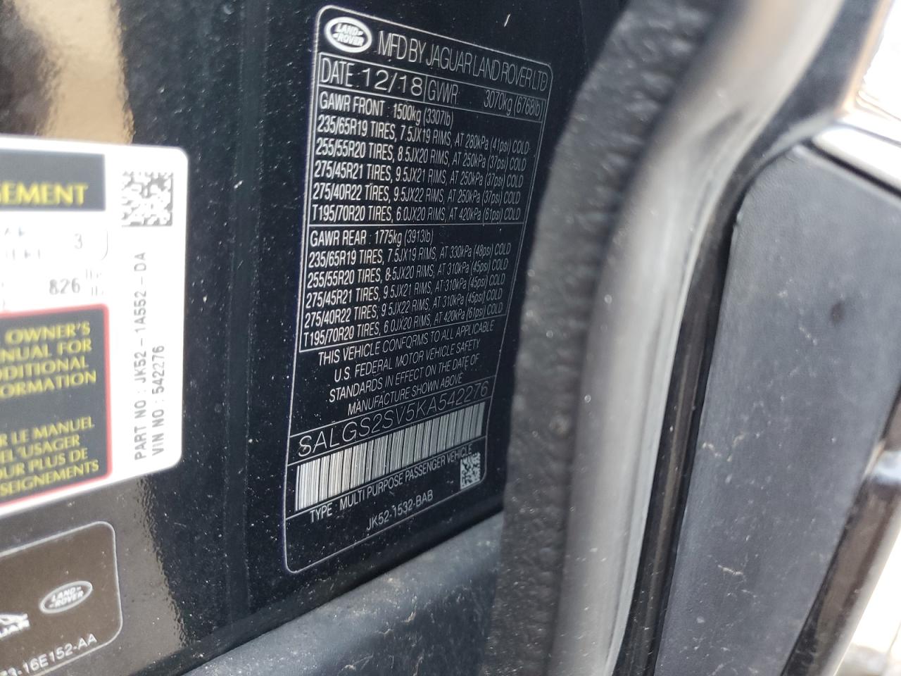 LAND ROVER RANGE ROVER 3.0 2019 р.в., Повний привід (SALGS2SV5KA542276) з США