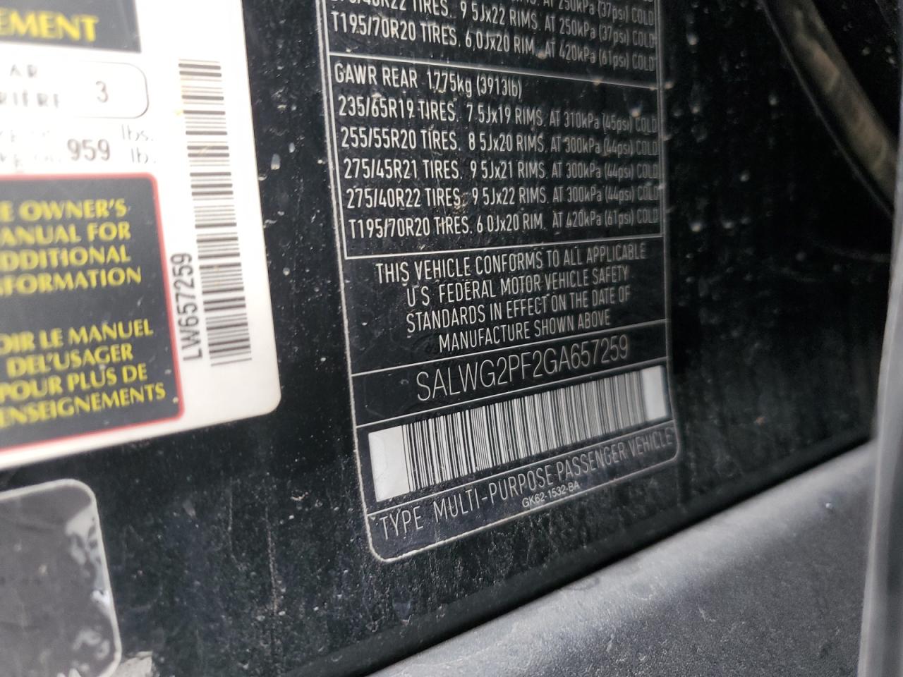 Колір ЧорнийЦиліндри 6Привід 4x4 з заднім приводомVIN SALWG2PF2GA657259Стан НевідомоУшкодження Передня або задня