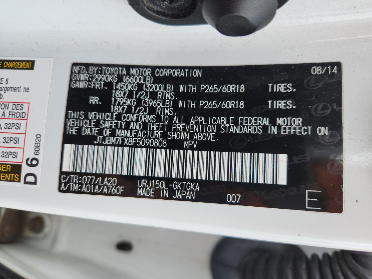 Колір БілийЦиліндри 8Привід Повний привідVIN JTJBM7FX8F5090808Стан Заводиться та їде (перевірено)Ушкодження Передня або задня