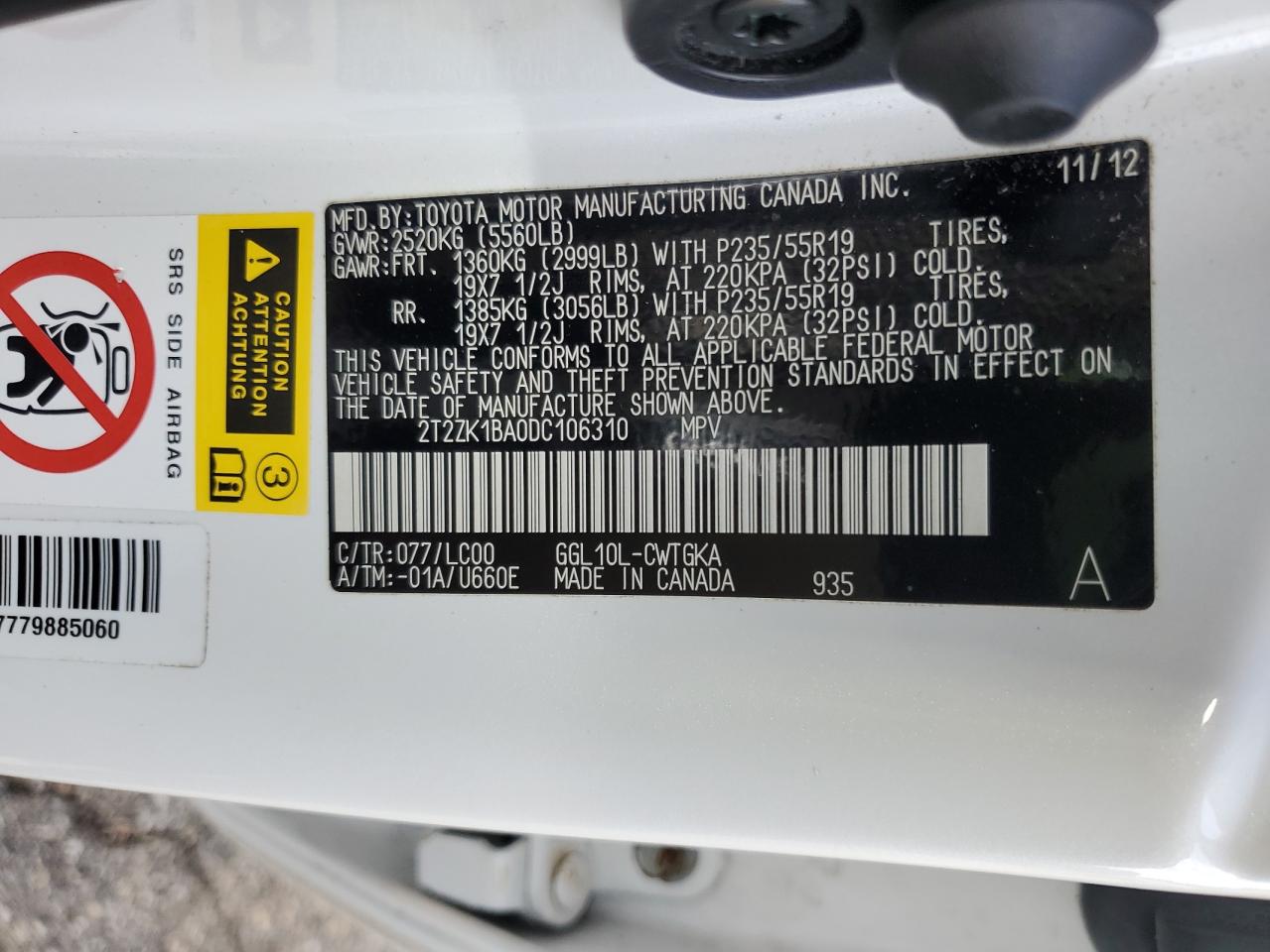 Колір БілийЦиліндри 6VIN 2T2ZK1BA0DC106310Стан НевідомоУшкодження Передня або задня
