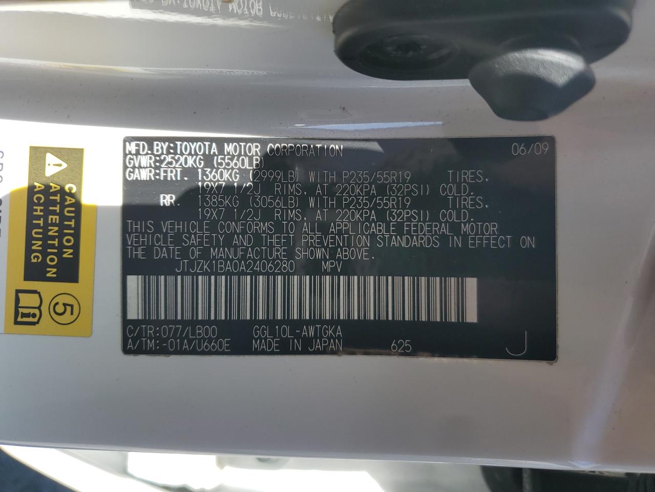 Колір БілийЦиліндри 6VIN JTJZK1BA0A2406280Стан Заводиться та їде (перевірено)Ушкодження Незначні
