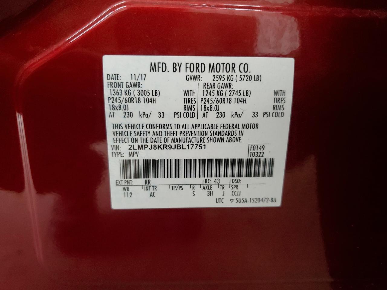 Колір ЧервонийЦиліндри 6Привід Повний привідVIN 2LMPJ8KR9JBL17751Стан Заводиться та їде (перевірено)Ушкодження Передня або задня