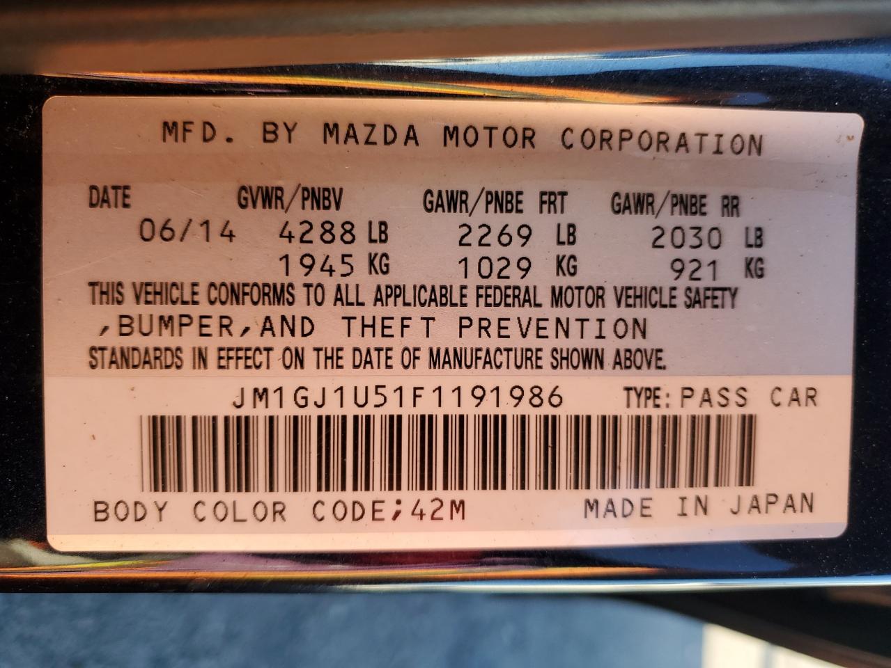 MAZDA 6 2.5 2015 р.в., (JM1GJ1U51F1191986) з США