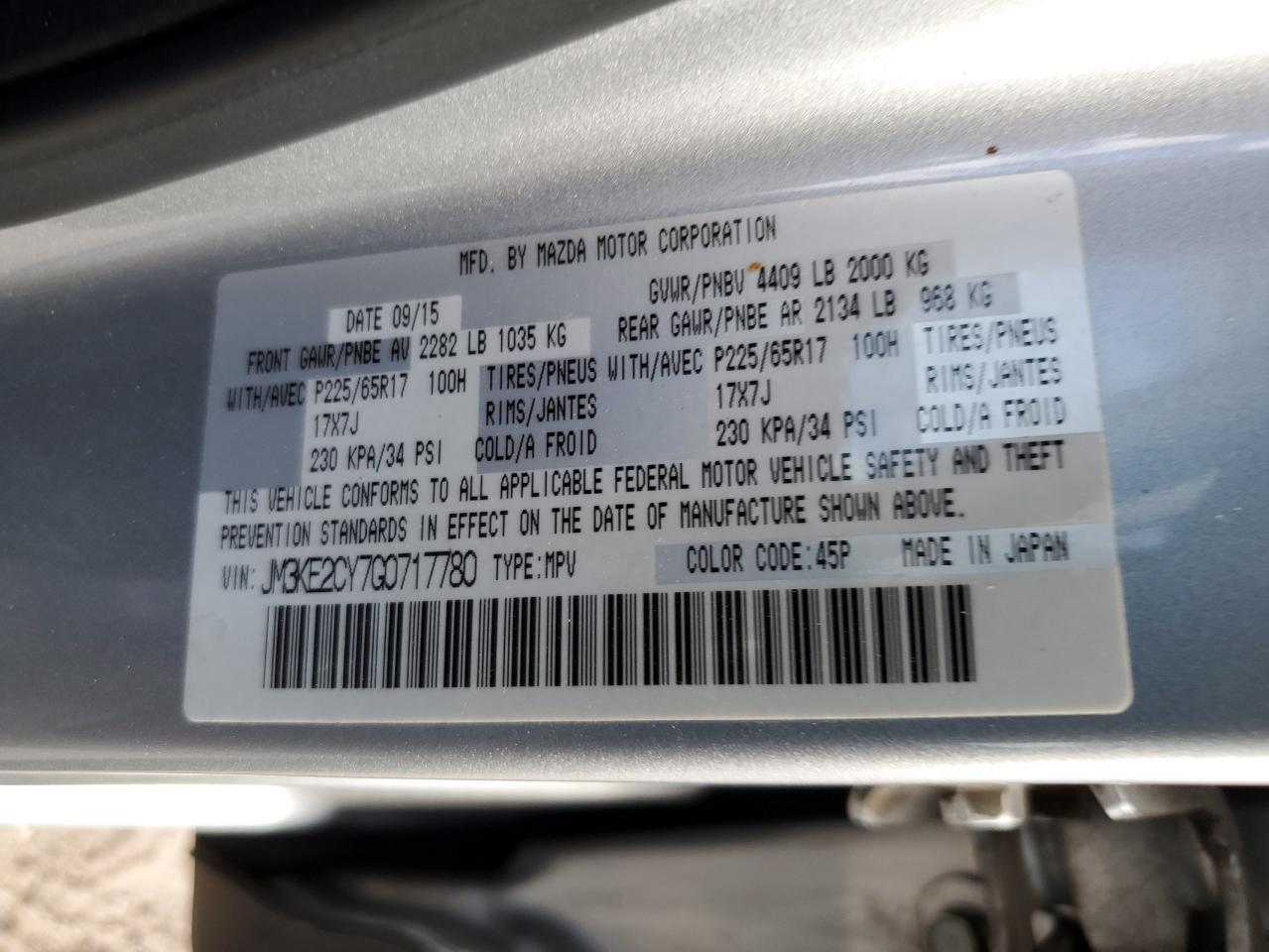 Колір СрібнийЦиліндри 4VIN JM3KE2CY7G0717780Стан ЗаводитьсяУшкодження Передня або задняДата аукціону 2025-10-31
