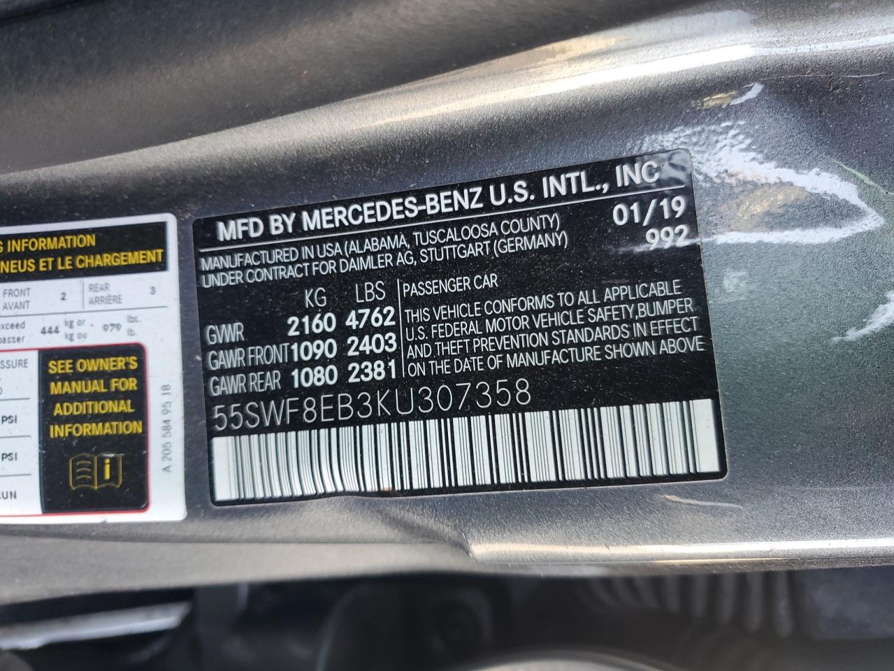 MERCEDES-BENZ C-CLASS 2.0 2019 р.в., Повний привід (55SWF8EB3KU307358) з США