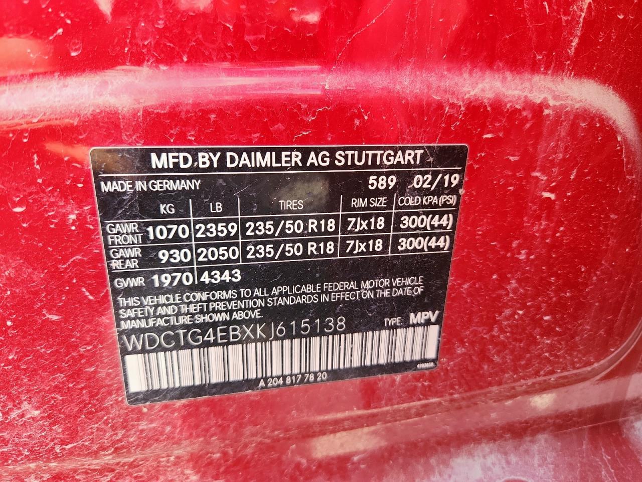 Колір ЧервонийЦиліндри 4VIN WDCTG4EBXKJ615138Стан НевідомоУшкодження Передня або задняДата аукціону 2025-11-06