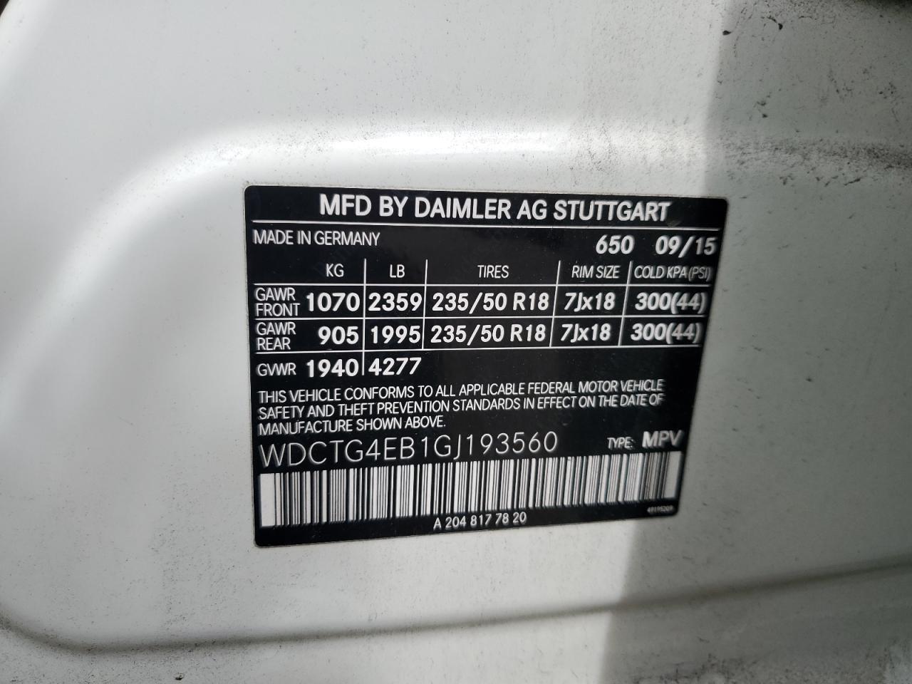 Колір БілийЦиліндри 4VIN WDCTG4EB1GJ193560Стан Заводиться та їде (перевірено)Ушкодження Задня