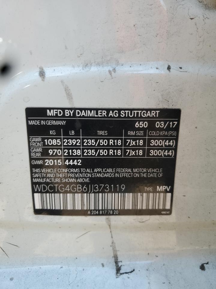 Колір БілийЦиліндри 4Привід Повний привідVIN WDCTG4GB6JJ373119Стан НевідомоУшкодження Передня або задня