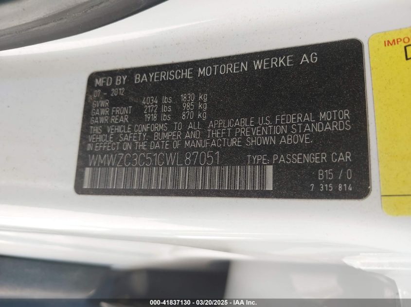 Колір БілийЦиліндри 4Привід Передній привідVIN WMWZC3C51CWL87051Стан Заводиться та їде (перевірено)Ушкодження Вандалізм