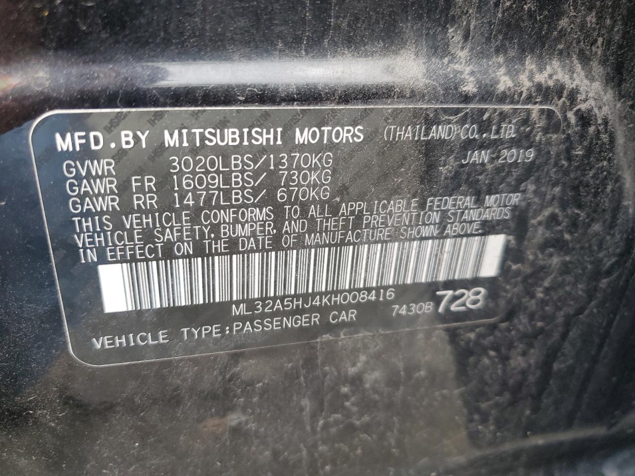 MITSUBISHI MIRAGE 1.2 2019 р.в., (ML32A5HJ4KH008416) з США
