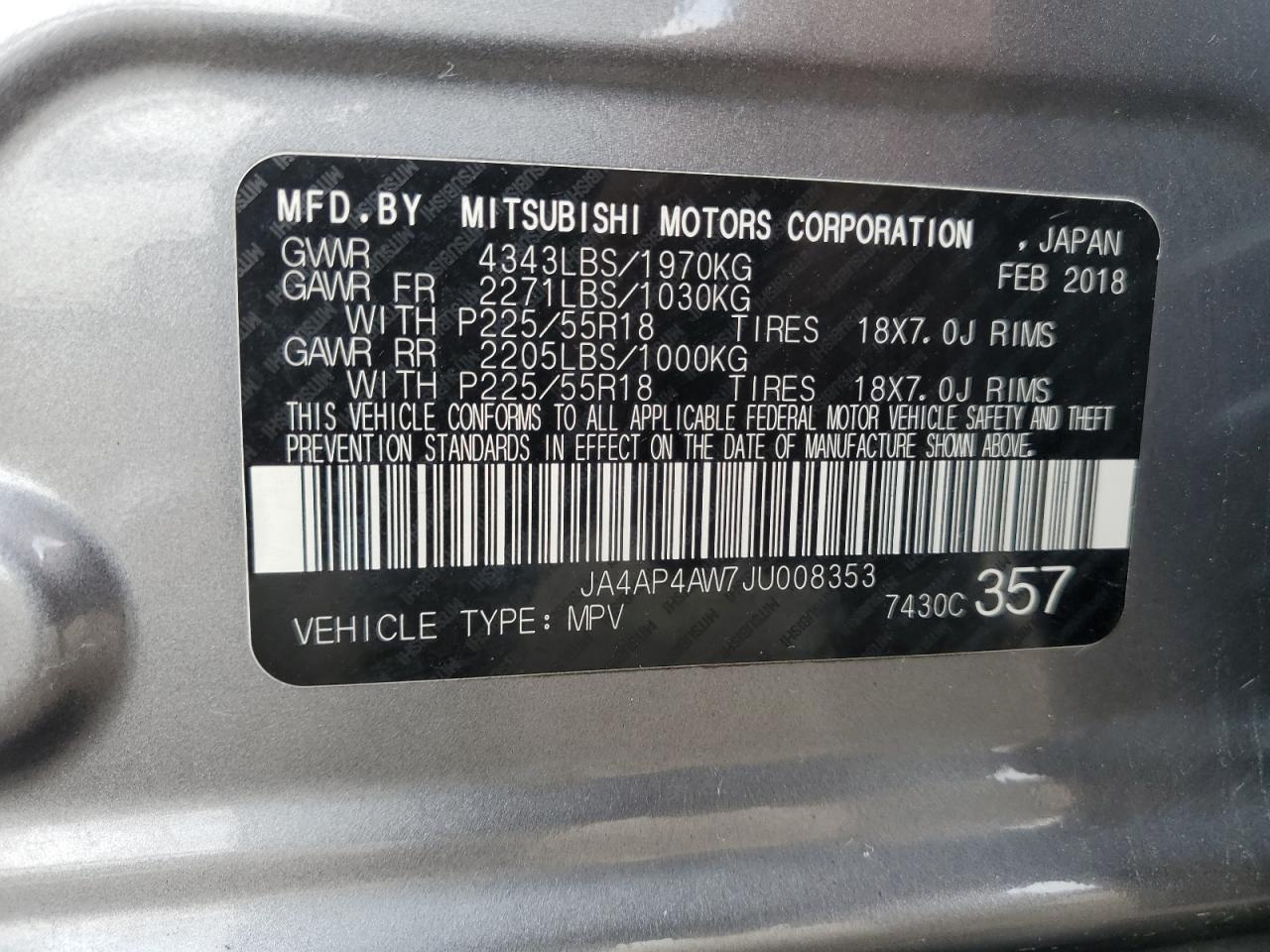 Колір СірийЦиліндри 4VIN JA4AP4AW7JU008353Стан Заводиться та їде (перевірено)Ушкодження Передня або задня