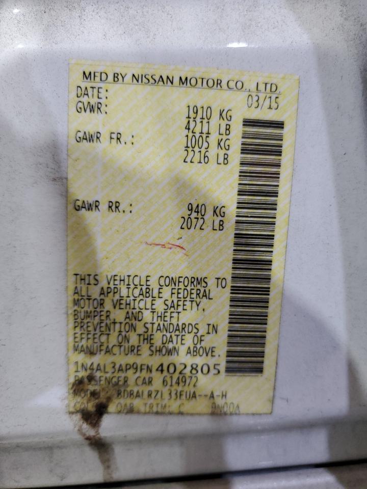 Колір БілийЦиліндри 4VIN 1N4AL3AP9FN402805Стан Заводиться та їде (перевірено)Ушкодження Задня