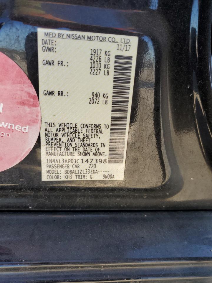Колір ЧорнийЦиліндри 4VIN 1N4AL3AP0JC147398Стан Заводиться та їде (перевірено)Ушкодження Передня або задня