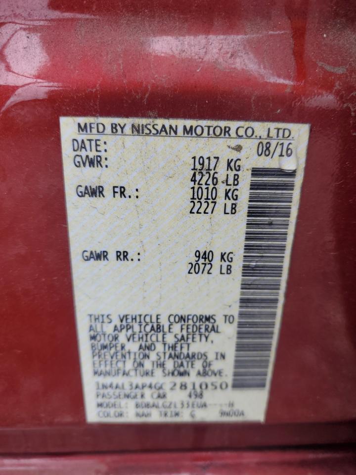 Колір ЧервонийЦиліндри 4VIN 1N4AL3AP4GC281050Стан Заводиться та їде (перевірено)Ушкодження Передня або задня
