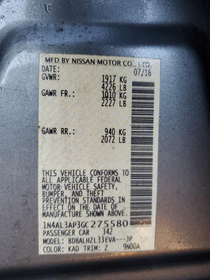 Колір СірийЦиліндри 4VIN 1N4AL3AP3GC275580Стан НевідомоУшкодження Передня або задня